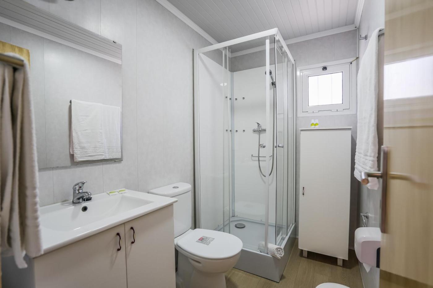 Bungalow com 2 Quartos. Este bungalow moderno beneficia de um alpendre onde os hóspedes poderão relaxar, de um quarto duplo, de um quarto twin, de um roupeiro, de uma casa de banho, de uma sala de estar, de uma cozinha, de roupa de cama e de toalhas. ;